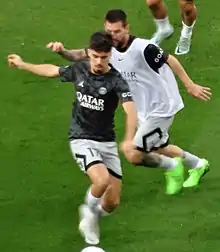 Vitinha made his debut for the club on 31 July, starting in PSG's 4–0 victory over Nantes in the Trophée des Champions, registering a 100% passing rate, completing 43 out of his 43 passes, while also being booked in the match and winning his first trophy with the club.[21] Afterwards, his performances throughout the season were highly lauded, and he received various praises on the central midfield combination of him and Marco Verratti and for his quick adaption into his new team, despite fierce competition from more experienced players like Carlos Soler, Renato Sanches and Fabián Ruiz.[22][23] On 15 April 2023, Vitinha scored his first goal for PSG, a long-range strike in a 3–1 home victory over Lens.[24] During the season, he was a key contributor to his team's record 11th Ligue 1 title.[25]