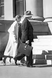 After the premier's testimony was completed, Smith called his wife, Florence Brownlee.[30] She supported her husband's account of MacMillan's relationship with the Brownlee family and reported that, when the premier drove MacMillan home at night, he was very seldom late returning.[44] On cross-examination, she denied that she would have defended her husband if she believed him to be guilty.[45] Additional witnesses for the defence included Brownlee's personal secretary, Civil Service Commissioner Frederick Smailes, and four legislature janitors. Smailes acknowledged knowing at the time of MacMillan's hiring that she was acquainted with Brownlee, but denied involvement on Brownlee's part in the decision to hire her, while the janitors denied ever seeing a young woman enter the premier's office in the evenings.[46] Jessie Ellergert, who had worked for the Brownlees as a maid, said that she had no reason to believe that there was a sexual relationship between the premier and MacMillan; moreover, she specifically recalled the Halloween night MacMillan had referred to in her testimony, and testified that the household was far too bustling for the alleged sex to have occurred.[47]