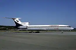 Flight 2801 was a chartered flight flown by Vnukovo Airlines on behalf of Arktikugol, which operated mines at the two company towns of Barentsburg and Pyramiden in Svalbard.[3] The aircraft was a Tupolev Tu-154M, with registration RA-85621, and serial number 86A 742. Its manufacture date was 14 January 1987.[1]: 15 The crew consisted of captain Evgeny Nikolaevich Nikolaev (aged 44), co-pilot Boris Fedorovich Sudarev (aged 58),[lower-alpha 1] navigator Igor Petrovich Akimov (aged 50), flight engineer Anatoly Matveevich Karapetrov (aged 38), five cabin crew members, and two technicians. The captain had previously landed at Svalbard Airport; the co-pilot had not.[1]: 7–8