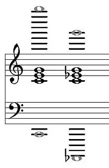 Vogel claims that his formula entails also compositional consequences. If one wants a chord to be consonant, major chords should be composed such that thirds and sevenths are set in a high register. Minor chords, however, would have to be set the other way round, with thirds and sevenths being set in a low register. This is by no means compatible with the compositional practice of the last centuries (with perhaps the exception of the Tristan chord, see below). In consequence, minor chords set along Vogel's composition rules sound unfamiliar. They exhibit, however, a better congruency of harmonics than their classical variants. The left-hand of the two C minor chords in the adjoining figure is composed in the classical way, with the third being set in a high register. The consonance value for this chord is 4.33. The right-hand minor chord features a low third. It sounds unfamiliar. Its consonance value is, however, much lower (3.0), and the congruency of its harmonics is much better.