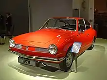 The Volkswagen Karmann Ghia are a family of three overlapping sporty Volkswagen model series, marketed in 2+2 coupe (1955–1975) and 2+2 convertible (1957–1975) body styles, though German production ended one year before that in Brazil. Internally designated the Type 14 (1955–1975), the Type 34 (1962–1969), and the Type 145 TC (1972–1975; Brazil), the Karmann Ghia cars combined the floorpans and mechanicals of the Type 1 / Beetle or Type 3 'ponton' models with styling by Italy's Carrozzeria Ghia, and hand-built bodywork by German coachbuilding house Karmann.[4]