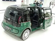 The Volkswagen Milano is a prototype of an electric taxi which was first presented at the Hanover Fair in April 2010.[1] It is a van type car with three doors, an 85 kW electric motor and a 45 kWh lithium-ion battery. The market introduction was planned for the year 2013, which did not occur for unknown reasons.[2]