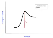 A common shape for current vs potential voltammogram measuring maximum peak current[4]
