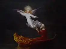 The final painting, Old Age, is an image of death. The man has grown old; he has survived the trials of life. The waters have calmed, the river flows into the waters of eternity. The figurehead and hourglass are missing from the battered boat; the withered old voyager has reached the end of earthly time. In the distance, an angel descends from heaven, while the guardian angel hovers close, gesturing toward the other. The man is once again joyous with the knowledge that Faith has sustained him through this perilous life to the promise of Heaven. The landscape is practically gone, just a few rough rocks represent the edge of the earthly world, and dark water stretches onward. Cole describes the scene: "The chains of corporeal existence are falling away; and already the mind has glimpses of Immortal Life."[10]