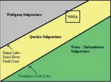 Most of the rocks in the park belong to the Archeon Quetico Subprovince, of the Superior Physiographic province, associated with the Kenoran Orogeny. These consist of schists and gneisses in the west and central portion of the park, and granitic rocks of the Vermillion Granitic Complex (2.69 to 2.64 Ga) in the east and southeast. The Kabetogama-Kenora dike swarm (2.2. to 2.1 Ga) follows a northwesterly trending Precambrian fault system. The northwest corner of the park contains metamorphosed rocks of the Wabigoon subprovince, which form a northeast trending greenstone belt. A lateral strike-slip fault separates the two subprovinces, referred to as the Rainy Lake-Seine River fault zone. It is this northwest area of the park, on the Kabetogama peninsula, which saw a gold rush from 1893 to 1898. The Little American Mine, on Little American Island, is one of 13 abandoned mines within park boundaries. Terminal moraines are found in the southern portion of the park, while the northern portion contains glacially scoured lake basins, but accumulations of glacial outwash and glacial till less than 100 feet is the norm. Lake Agassiz deposits are evident within the park, while glacial striations and glacial erratics are common.[5][7][8]