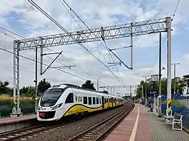 Since 2009, with an interruption between February and December 2015,[4][5] three daily Regional-Express trains run on the Węgliniec–Görlitz railway, on service between Wrocław Główny railway station and Dresden Hauptbahnhof. Additionally, Koleje Dolnośląskie run eleven weekday trains between Węgliniec and Zgorzelec in each direction, as well as two daily trains between Węgliniec and Lubań, through Zgorzelec Miasto bypassing the Zgorzelec railway station.