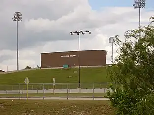In January 1978, Aldine ISD announced plans for a new $4.39 million, 10,000-seat stadium to replace Aldine Athletic Stadium in time for the start of 1979 high school football season.[21] The stadium would be located on a 47-acre plot on Aldine-Bender Road, just to the east of Aldine-Westfield, near the district's central office and its original set of schools. The stadium's design would be similar to that of the then-recently opened Mercer Stadium in Fort Bend ISD.[22]