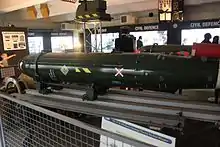 There were several proposals to adapt WE.177A for other delivery systems. Among them were proposals to re-engineer the WE.177A warhead into two submarine-launched heavyweight torpedoes, which received some attention. The Mk.24N Tigerfish nuclear-armed torpedo had approved project status for some years, but was eventually shelved. Its raison d'être was to overcome the performance shortcomings of the Tigerfish torpedo, and especially its failure to meet the dive-depth requirements needed to counter deep-diving Soviet SSNs and SSBNs that had outstripped western torpedo performance.[11] There was also a proposal endorsed by Flag Officer Submarines (FOSM), the Royal Navy's professional head of the Submarine Service, to use the WE.177A warhead in another torpedo, the shallow-running unguided Mk.8 torpedo of World War II vintage.[11] A Mk.8 torpedo was chosen to sink the Argentinian warship General Belgrano, because it was of proven reliability, unlike the unreliable Tigerfish. This proposal did not gain approved project status, although its raison d'être was similar to that for Tigerfish, and intended to counter extended delays in Tigerfish development. FOSM's proposal stated that a 10 kt nuclear detonation at the Mk.8 torpedo's running depth of approximately 40 feet (12 m) would destroy a deep-diving SSN at 2,000 feet (610 m) depth.