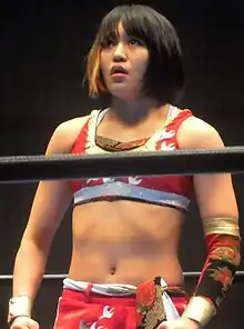 On October 12, 2012, Tajiri, the founder of Wrestling New Classic (WNC), announced the creation of the WNC Women's Championship, with a six-woman single-elimination tournament starting on October 26 in Korakuen Hall.[1] The six participants were announced as Kana, Syuri, Lin Byron, Makoto, Nagisa Nozaki and Jessica Love, a Finnish wrestler, who was born male, but underwent a sex reassignment surgery in 2011 to legally become female.[1] The first round of the tournament was decided that same day by a random draw, conducted by Tajiri and WNC president Tsutomu Takashima, which resulted in Love and Nozaki getting byes directly to the semifinals.[1][9] The first first round match took place on October 26 and saw Syuri defeat Lin Byron to advance to the semifinals against Jessica Love.[10] The second first round match took place on November 26 and saw Kana defeat Makoto to advance to the semifinals against Nagisa Nozaki.[11] In the semifinals two days later, Syuri defeated Jessica Love, while Nagisa Nozaki eliminated the inaugural Smash Diva Champion, Kana, setting up a final match between the two.[12] On December 27, Syuri, the final Smash Diva Champion, defeated Nagisa Nozaki to become the inaugural WNC Women's Champion.[4][13][14][15]
