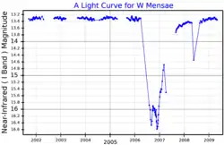 The variability of W Men was discovered in 1927 by W. J. Luyten.[10] It belongs to the very rare R Coronae Borealis class of variables which are often called "inverse novae" since they experience occasional very large drops in brightness. At minimum brightness, W Men has a photographic (blue) magnitude less than +18.3, being undetectable on photographic plates at the time.[11] The drop in brightness is less pronounced at longer wavelengths, and the overall luminosity of the star is thought to be largely unchanged. The variations are caused by condensation of dust which temporarily obscures the star. Short wavelengths of light are absorbed and re-emitted as infra-red. Many R CrB variables show small amplitude pulsations and W Mensae has a pulsation period of approximately 67 days.[6]