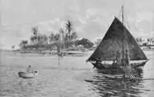 Wa may be sailed over long distances, paddled, or moved by punting.[11] One analysis of wa under sail indicated "conclusively that these primitive craft are superior to a modern boat on significant points of sailing."[1] They were estimated by Anson in 1776 to be able to move at or perhaps beyond wind speed, and to have better windward pointing ability than any craft previously encountered.[upper-alpha 10] Several early western observers stated they were "capable of 22 knots (41 km/h; 25 mph) for sustained periods".[upper-alpha 11] Edwin Doran, author of Wangka: Austronesian Canoe Origins (1981), cited a 14-knot (26 km/h; 16 mph) average for a wa traveling from Guam to Manila.[13] Benjamin Morrell reported in 1831 that he had "seen these boats going at the rate of eight miles per hour (13 km/h), within four points of the wind" and that he had "no doubt but they will go at the rate of twelve or thirteen [13 mi (21 km)] miles an hour in smooth water".[upper-alpha 12]