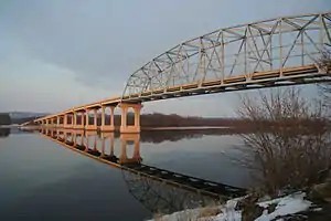 ![]() The bridge reflected in the Mississippi River, seen from upstream on the Minnesota side | |