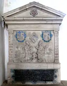 - Margaret Wadham, wife of Nicholas Martin (died 1595) of Athelhampton Hall, Dorset. The couple's monumental brass, showing them kneeling beneath an escutcheon with the ancient arms of FitzMartin (Argent, two bars gules) impaling Wadham, survives in St Mary's Church, Puddletown, Dorset.[34] Nicholas Martyn, in full armour, kneels bare-headed before an altar on which is an open book. His three sons, who all predeceased him, kneel behind him. To the right is his wife Margaret Wadham, behind whom kneel their seven daughters, of whom four survived as co-heiresses.[35]