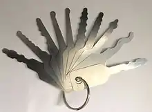 Most wafer tumbler locks with poor tolerances can be opened with a set of jigglers or try-out keys. These sets of keys are designed with the most common patterns of key available. The key is inserted into the lock like a normal key, and a turning force is applied whilst the key is raked back and forth until the lock opens.