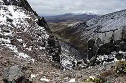 ![]() View from the southern end of Waihi Fault Zone north. A strike of the Waihi-South fault commences across the valley in the foreground and the fault zone extends past the western slopes of the Mount Tongariro massive in distance. The top of the cone of Mount Ngauruhoe is hidden by cloud but is to the east of the fault zone, as are the snow covered areas of Mount Tongariro behind it. | |