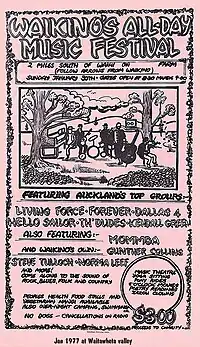 The event was staged as a forerunner to the Nambassa festivals and was a community project run by Peter Terry. The Waikino festival was originally intended as an eight-hour all day music and cultural event, however, a steady flow of bands, buskers and poets from around Auckland and the Waikato spontaneously rocked up to perform. Consequently, the event ran non stop for 24 hours[1] and attracted 5000 patrons. It took place at Franklin Road, Waitawheta Valley, Hauraki.