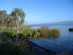 The area has a range of wetlands, including sedgelands, open water and lagoons, lakeshore mudflats, saltmarsh and ephemeral wetlands. Raupō (bullrush) grows up to three metres tall.[6] The main Lake Wairarapa is relatively shallow, with a depth of about 2.5 metres.[1][7]
