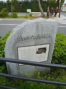 About 300 m after Geba are the remains of the great Hama no Ōtorii. The name appears several times in the historical records, and we know from the Shinpen Kamakurashi that it indicated what today we call Ichi no Torii, the gate closest to the sea.[4] This symbolically and religiously important gate was destroyed and rebuilt many times. The Azuma Kagami says that, on November 22, 1215, a new Hama no Ōtorii was built in Yuigahama to replace the old one which had been destroyed by a storm.[19] The replacement didn't last long, because a strong earthquake (and the consequent tsunami) destroyed it together with its shrine on May 15, 1241.[20][21]