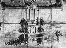 Today's Ichi no Torii is about 180 m to the south. We don't know where Hama no Ōtorii used to stand in the Kamakura period, but it is certain that the shoreline a thousand years ago was much behind today's, so the sea was probably very close to the great gate.[5] This particular torii was the point where Tsurugaoka Hachiman-gū's approach met the water, a symbolic link between a road sacred to the city's tutelary kami Hachiman and the sea.[5] As such, it had great religious importance. Since all the crossings with other big roads where further north, this spot was probably not very frequented, but it was here however that periodically was held a ceremony to calm a wind called Fūhakusai (風白祭).[5] Its great religious significance can be guessed also from the fact that, during the Muromachi period, every February[23] the Kantō Kubō (the shōgun's representative in western Japan) would come and walk seven times around Hama no Ōtorii.[3][5] The kubō would meditate at Tsurugaoka Hachiman-gū for a week, and during that period he would walk seven times around this great gate.[3]