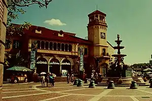 Wakayama Marina City is one of ten artificial islands in Wakaura Bay, a feature of the larger Osaka Bay. It was built from fill removed from a nearby mountain, and is disconnected from the coastline, except for two bridges to the mainland. There are also two saltwater canals crossing the island. Construction of the island began in April, 1989. It opened to the public in 1994.[3] Marina City was originally developed by Matsushita Investment and Development Company, Ltd. (MID) and Wakayama Prefecture.[4] It now supports a large marina, run by the Wakayama Marina City Yacht Club, the Wakayama Marina City Hotel (sometimes called the Royal Pines Hotel), the Kuroshio Ichiba (fish market), the Kuroshio Onsen (spa) and Porto Europa, a theme park created by MCA (Universal Studios).[5] At that time, both MID and MCA were owned by Matsushita Electric Industrial Company (MEI),[6] which has been rebranded to Panasonic since 2008.[7] MEI bought MCA in 1989.[8]