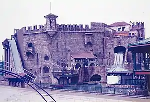 The Porto Europa theme park was created by MCA Planning and Development (P&D), which was Universal Studios' creative arm prior to its renaming as Universal Creative in 1997. The park was built using American specialty vendors and Japanese construction companies, and opened in July 1994. With a footprint of 4.5 acres (1.8 hectares), Porto Europa consists of three themed areas: a French, an Italian and a Spanish town.[9] There are three major attractions, a flume ride/dark ride combination, a motion simulator/film ride, and an indoor stunt show which is now closed, with the theater space empty. The smaller attractions at opening included a jazz club, disco, cinema, laser tag, and virtual reality installation.[10] There are also retail outlets, restaurants, and street shows.[11][12][13]