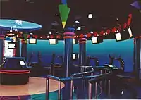 The Seafari simulator ride is in the French-themed village, and occupies the majority of the space in the main building. It features an extensive preshow, including a moon pool with a 29-foot submarine hanging over it, as if it has been launched and recovered from the deep below. Guests move from the moon pool area to the Aqualab where they meet Sammy, a CGI dolphin who appears to be swimming in a 13-foot tank at guests' eye level. From this space, guests move into a 15-passenger themed submarine, which is in the actual motion base theater. The Seafari motion bases are by Hughes Training.[15] The ride film is a 3.5 minute Computer-generated imagery (CGI) short, in color, produced by Rhythm & Hues.[16] At the time, it was considered one of the best CGI animated films ever made.[17][18] The film was later used at PortAventura Park in Spain, renamed WorldSea Odyssey 4D. It opened there in 1999. Universal Studios owned PortAventura World at the time.[19]