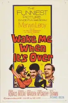 Wake Me When It's Over is a 1960 DeLuxe Color comedy film directed by Mervyn LeRoy and starring Ernie Kovacs and Dick Shawn in CinemaScope. The screenplay concerns a World War II veteran who gets called back into service by mistake and sent to a dreary Pacific island. The film is based on the novel of the same name by Howard Singer. The title song was written by Sammy Cahn (words) and James Van Heusen (music) and sung by Andy Williams.