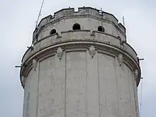 The 12-sided tower is 134 feet (41 m) tall, with walls 18 inches (460 mm) thick, and a capacity of 1,000,000 US gallons (3,800,000 L; 830,000 imp gal). The tower is topped by crenellations and 12 arched windows. It was constructed using a 14-day continuous pour.[3]