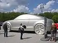 It is 10.2 m (33 feet) long, 4.5 m (15 feet) wide and 3.25 m (10.7 feet) high, weighing more than 10 metric tons (22,000 lb). Using 1,000 m2 (11,000 square feet) of glass fiber reinforced plastic lining and 120 m3 (32,000 US gallons; 26,000 imperial gallons) of Neopor foam, the sculpture Das Automobil comprises 16 steel segments on a steel frame. The sculpture was designed by the German car manufacturer Audi. More than 100 people were involved in the making. The public interest was high when the sculpture was unveiled on the western side of the Brandenburg Gate on April 6, 2006. Besides the mayor Klaus Wowereit, 600 guests, 100 photographers, TV crews and journalists took part in the celebrations.