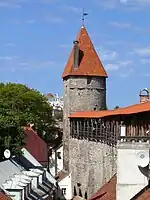 The first wall around Tallinn was ordered to be constructed by Margaret Sambiria in 1265 resulting in its name, the 'Margaret Wall.' This wall was less than 5 metres (16 ft) tall and about 1.5 metres (4.9 ft) thick at its base.[1] Since that time it has been enlarged and strengthened. The walls and the many gates are still largely extant today. This is one of the reasons that Tallinn's old town became a World Heritage Site. The walls were enlarged in the fourteenth century, and citizens of Tallinn were required to turn out for guard duty, which meant to wear their armour and demonstrate their readiness to face invaders.[2]
