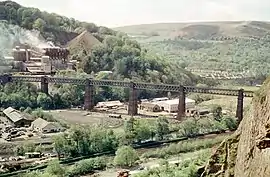 Later renamed the 'Penrhos Branch' by the GWR, post-nationalisation it came under the control of British Railways. On 31 March 1963, a fire destroyed Tynycaeau Junction signal box and BR decided not to rebuild it, and hence the Penrhos Branch section from the Walnut Tree tunnel southwards to Tynycaeau Junction was maintained as its original double track but given 'long siding' status and as Steetley Dolomite workings had always necessitated a run-round by the steam locomotive, which could not be performed at the Walnut Tree West rail connection due to the permanent way layout, the loco' had to travel 'light engine' for a round trip of 7¼ miles by running to Tynycaeau Junction and crossing over from down to up line near the former junction with the Cadoxton-Wenvoe-Pontypridd line. With the signal box out of action at Tynycaeau, the crossover was modified to sprung points from down to up line. Eventually even that section was curtailed and sleeper stops placed on both lines at the Walnut Tree tunnel north portal.[4] The double track south of Walnut Tree tunnel had been lifted by August 1965. The remaining branch was later worked as a single-track long siding from Penrhos to the Steetley Dolomite limestone quarry, just south of the viaduct, the permanent way layout having been modified.[5] The last train to the quarry ran over the viaduct in 1967.[6] The remaining permanent way to Penrhos yard and Junction was not lifted until the decommissioning of the whole line in 1969. By the late 1990s the tunnel was gated and by the year 2000 the quarry had breached the tunnel lining, leaving a 50 yards (46 m) air gap in its structure.[4]