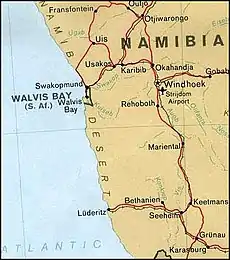 In 1990, South West Africa gained independence as Namibia, but Walvis Bay remained under South African sovereignty, with South Africa increasing the number of troops.[27] However, in 1992, the two countries agreed to establish a transitional Joint Administrative Authority for Walvis Bay and the Offshore Islands.[28] The Authority was headed by two Chief Executive Officers, Nangolo Mbumba, then Secretary to the Namibian Cabinet, and Carl von Hirschberg, former South African Ambassador to the United Nations.[29]