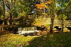 War Memorial Park is a public park in West Bridgewater, Massachusetts. It is located south of the town center, bounded by River Street, Arch Street and the Town River. The park was established in the 1930s and was constructed in part with funding from the Works Progress Administration. The park is located at the site of West Bridgewater's earliest industrial activities, a mill site dating to the 17th century. This early use spawned a variety of other water-powered industrial uses in the 18th and 19th centuries, and was notably the site of Ames Shovel Company's first factory. The 1936 creation of the park resulted in the donation of a large number of historic industrial artifacts, which are displayed on its grounds.[2]
