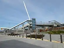 In February 2016, the city approved plans for a cable-stayed pedestrian and bicycle bridge connecting the station mezzanine to a new plaza on the west side of the tracks, to which pedestrian access has been otherwise deemed difficult. The bridge, then planned for completion in 2018, would provide access from the new developments and the adjacent Tesla Factory, which had no convenient pedestrian route to the station because of the rail lines.[24] During the bidding process, the cost of the bridge was increased from $25 million to $35 million, and completion delayed to 2020.[25] Construction began in early 2019.[26] The main span was put in place in September 2019.[27] After additional delays, the bridge opened on February 3, 2022, at a final cost of $41 million.[28][29][30]