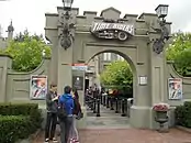 In May 1994, Warner Bros. purchased the location, and began construction on "Warner Bros. Movie World Germany". The park had a grand opening on 29 June 1996 with 20,000 invited guests including Johannes Rau, Ernst Löchelt, August Everding, Gustava Everding, Michael Douglas, Sophia Loren, Ron Williams, Amanda Lear, David Copperfield, Claudia Schiffer, Arnold Schwarzenegger, George Clooney, Chris O’Donnell, Alicia Silverstone, Joel Schumacher, Hans Meiser and Heinz Hoenig as special guests.[2][3][4][5][6] The park opened to the general public on 30 June 1996.[1] Zeitgeist Design and Production's Ryan Harmon served as the Director of Show Development for Warner Bros. International Recreation Enterprises, where he conceived, wrote and managed the design team for Warner Bros. Movie World in Germany's worth of rides, shows and attractions.[7] Botticelli's - Atelier der angewandten Malerei and Sanderson Group were responsible for designing and painting the theming for the park.[8][9] Alan Griffith Architect and Alder Constructions were also involved in the park's development.[10][11]
