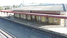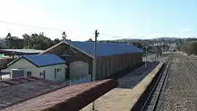 The station building is also a single-storeyed sandstone building on a north–south axis, with the platform running along its eastern side. The western facade features an entrance portico and verandah. The roof is hipped and mainly of corrugated asbestos cement sheet, apart from the kitchen wing which is corrugated iron. Above the roof are two rendered chimneys with decorative mouldings and a cornice. There is a cantilevered steel awning over the platform, which continues past the Station building in both directions.[1]