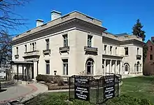 The Gale Mansion, at 2115 Stevens Avenue South, was built in 1912 to designs in the Renaissance Revival style by Ernest Kennedy of Minneapolis. In 1855, the 40-acre (16 ha) tract had been purchased for $50. Water company records indicate that several smaller houses once occupied the Stevens Avenue site.[4] The owner, Edward Chenery Gale, was the son of Minneapolis pioneer real estate broker Samuel Gale. His wife, Sara Belle Pillsbury, was a daughter of Governor John S. Pillsbury. The house, now owned by the American Association of University Women, is faced in Bedford limestone. Many modern features were part of the design: a central vacuum-cleaning unit, a kitchen at ground floor level, rather than secreted in the basement, an intercom system. The house was centrally heated with a coal furnace; the decorative fireplaces were infrequently used.[2] In the garden stands a fountain with the sculpture Boy with a Duck by Frederick MacMonnies.