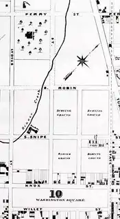 Washington Park has been public property since the Dongan Charter was granted to Albany incorporating it as a city. The charter specified that all land not privately owned at the time became property of the Mayor, Aldermen, and Commonalty of the city of Albany, including the land that would become the site of Washington Park.[1][9] A portion of the land was set aside for a structure built to house gunpowder in 1802, and in 1806 the areas between Willett and Knox streets, and between State Street and Madison Avenue, became the Middle Public Square.[10] In 1800, the land west of Knox Street to Robin Street and south from State Street to Hudson Avenue was taken for a cemetery, which was apportioned into sections for each of Albany's churches. There were separate sections for African-Americans and for strangers.[6][11] West of the cemetery was the alms-house farm and the penitentiary grounds. In 1809 the Middle Public Square was renamed Washington Square, and later the Washington Parade Ground.[10] In 1868 the remains and headstones in the cemetery were removed and reinterred, most to Albany Rural Cemetery, and some to the cemeteries of other churches.[6]