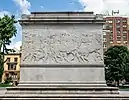 - Soldiers and Sailors' Monument is a marble monument sitting on a granite base with a bronze statue representing the Nation, holding the palms of victory. The monument is built of Tennessee marble above the seat and the remainder is of Stony Creek granite. It is 22 feet (6.7 m) high, 21 feet (6.4 m) long and 5.5 feet (1.7 m) deep, surrounded by a seat, the whole resting upon a platform 70 feet (21 m) long by 64 feet (20 m) deep. It sits at the Henry Johnson Boulevard entrance from State Street to the park. The monument represents "The Nation at Peace Won Through Victorious War".[21] It was finished in 1911 by American Sculptor Hermon A. MacNeil and erected in 1912 by the Grand Army of the Republic as a monument to Civil War veterans.[21][25] The monument was restored in 1986 and renamed the Albany Veterans Memorial Monument with an unveiling by two 85-year-old women who, as 12-year-olds, had unveiled the monument when it was first erected in 1912. [25]