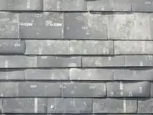 Structurally, the building is timber-framed[15] and uses a mixture of reclaimed wood and plywood from various sources around Brighton. It has been constructed on foundations of ground granulated blast-furnace slag.[4][13] The "rather unusual"[15] walls consist of a mixture of waste chalk and clay left over or reclaimed from building sites.[15] These are compressed into rammed earth-style walls using pneumatic equipment—a technique which improves the building's energy conservation, because such walls store solar energy for a long time.[12] On the outside the walls are covered with "a scaly surface of rubbery black shingles"—2,000 carpet tiles from an old office building in Brighton. Their fire-retardant, waterproof underlay faces outwards, providing weatherproof cladding and insulation.[2][4] Their mostly black appearance is varied in places by being laminated with plastic bags in various colours.[7] Between the carpet tiles and the walls themselves, some new material was used: DuPont supplied about 400 square metres (4,300 sq ft) of "breathable membrane", to further weatherproof the building, and "Housewrap" moisture seal.[15] Inside, the walls are laid with reclaimed plasterboard coated with surplus paint from construction sites.[2] The main load-bearing wall is formed of 10 tonnes of compressed chalk spoil from a building site nearby.[4] Throughout the building, the space between the boarding and the exterior clay and chalk blocks has been filled with household rubbish which will act as insulation. Sensors have been installed to monitor how well heat is kept in,[4] which will form part of a PhD project for a University of Brighton student.[12][7] The insulation materials are revealed in various places by "little peephole windows"[2] (transparent panels in the walls):[4] as well as some secondhand conventional (polyurethane) insulation material,[2] there are floppy disks, 4,000 VHS cassettes, 4,000 DVD and video cases, two tonnes of denim offcuts from pairs of jeans and denim jackets, cycle inner tubes to insulate windows, and 20,000 toothbrushes.[2][4] The cassettes and other media came from the stock of rental shops which were closing down; an aeroplane cleaning company at nearby Gatwick Airport donated most of the toothbrushes, which were provided to First and Business Class passengers and discarded after one use,[12] and some others were provided by Brighton schoolchildren; and the denim came from textile traders[4][2][7] (in particular, one company which turned imported jeans into denim shorts by cutting off the legs).[2]