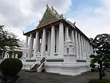 In the south side is the grand sanctuary of temple, which is called "Wihan Sila Khao". The King Mongkut ordered to bring another principal Buddha statue named "Phra Sila Khao" to place here in 1858. Nearby is also the site of the chapel, which is Thai-Chinese art as well, with "Phra Buddha Patima Chaiwat" or "Phra Chai Lang Chang" placed inside. On the back of the chapel, there is the white pagoda stand out, this is the Langka style pagoda that height is 45 m (147.64 ft) and putting inside with the Buddha relics. [2][1]
