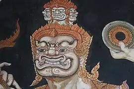 Statues of twelve yaksha (or giants) guard six of the temple's gates along three sides of the wall (all sides except the north). The giants are characters from the Ramakien epic, each distinguished by their skin colour and crowns. Each giant is about 5 metres (16 ft) tall, all clenching a mace or gada in front of them. Starting with the left giant in front of Gate No.1, the front Koei Sadet Gate, and going clockwise around the temple wall, Suriyaphop is red with a bamboo shoot crown, Intarachit is green with a similar crown, Mangkonkan is green with a Naga crown, Wirunhok is dark blue with a similar crown, Thotsakhirithon is dark red with an elephant's trunk instead of a nose and a bamboo shoot crown, Thotsakhiriwan is green with a similar nose and crown, Chakkrawat is white with a smaller head on the top of his crown of feathers, Atsakanmala is purple with a similar extra head but a normal crown, Thotsakan is green with two tiers of smaller heads on top of his crown, Sahatsadecha is white with multiple heads, Maiyarap is light purple with a cockerel's tail crown and Wirunchambang is dark blue with a similar crown.[72]