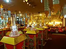 The "stern" of the ship enshrines four Buddha statues and replica footprints, including Thai and Chinese inscriptions.[2] The larger chedi has 20 wooden recesses, while the smaller one has 16.[4] There is also a room dedicated to relics, which some believe to come from Buddha.[5] The ubosot enshrines the principle of subduing Mara Buddha image and includes other buddha images.[2] Interestingly, on the doors and windows are painted images of a yaku jar (โถยาคู), a jar used for offerings in a royal ceremony. On the upper part of the door and back of the room is drawn a big Krathong (กระทง) in the style of used in the Loi Prathip Royal Lantern Festival (พระราชพิธีลอยพระประทีป). This kind of picture, at this size, is rare in Thailand.[2]