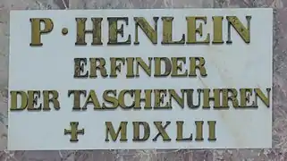 The Walhalla in Donaustauf, which is a memorial for "politicians, sovereigns, scientists and artists of the German tongue",[58] honors Peter Henlein with the words inventor of the watch.[lower-alpha 7][59]