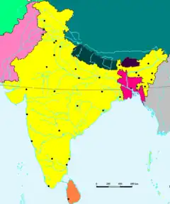 Water resources in India includes information on precipitation, surface and groundwater storage and hydropower potential. India experiences an average precipitation of 1,170 millimetres (46 in) per year, or about 4,000 cubic kilometres (960 cu mi) of rains annually or about 1,720 cubic metres (61,000 cu ft) of fresh water per person every year.[1] India accounts for 18% of the world's population and about 4% of the world's water resources. One of the proposed solutions to solve the country's water woes is the Indian rivers interlinking project.[2] Some 80 percent of its area experiences rains of 750 millimetres (30 in) or more a year. However, this rain is not uniform in time or geography. Most of the rains occur during its monsoon seasons (June to September), with the northeast and north receiving far more rain than India's west and south. Other than rains, the melting of snow over the Himalayas after the winter season feeds the northern rivers to varying degrees. The southern rivers, however, experience more flow variability over the year. For the Himalayan basin, this leads to flooding in some months and water scarcity in others. Despite an extensive river system, safe clean drinking water as well as irrigation water supplies for sustainable agriculture are in shortage across India, in part because it has, as yet, harnessed a small fraction of its available and recoverable surface water resource. India harnessed 761 cubic kilometres (183 cu mi) (20 percent) of its water resources in 2010, part of which came from unsustainable use of groundwater.[3][4] Of the water it withdrew from its rivers and groundwater wells, India dedicated about 688 cubic kilometres (165 cu mi) to irrigation, 56 cubic kilometres (13 cu mi) to municipal and drinking water applications and 17 cubic kilometres (4.1 cu mi) to industry.[1]