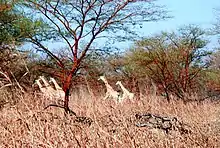 With the above topographic, climatic and soil settings, the vegetation types which cover the park are categorized under five broad types of open combretaceous shrub savanna, anogeissus leiocarpus woodland, lannea humilis open grass savanna, acacia seyal tree savanna and Yaéré floodplains with perennial grasses. In the desert conditions, with no perennial streams flowing through the park area, there are no perennial grasses in the park.[2] The water holes are created for animals.[8] The combretaceous shrub savanna consist of Sclerocarya birrea tree savanna, Combretum and Terminalia shrubs and the doum palm Hyphaene thebaica. The Anogeissus leiocarpus woodland is in sandy soils with Mitragyna inermis in pockets near temporary water bodies. Lannea humilis are open grass savanna combined with short annual grasses. Patches of trees and stands of Mitragyna inermis are also reported from small islands near temporary water bodies. In this condition, vegetation reported are in the formations of compact clay. However, the area is very saline due to high evaporation. The fourth category of vegetation comprises Acacia seyal tree savanna growing in black clay soils which gets highly saturated during the rainy months; grasses in these conditions spread very slowly or may even dry up. The last type of vegetation is reported in the Yaéré flood plains, an important area to maintain perennial grasses in the park. The grasses reported are: Vetiveria nigritana, Oryza barthii, Echinochloa pyramidalis and Echinochloa stagnina and a few herbaceous legumes with Sesbania pachycarpa. However, in these conditions, where there are no trees, forest fires are common.[2] A particular feature in the central and western parts of the park was that substantial areas were of annual grasses and herbs, interspersed by Acacia seyal shrublands. They were subject to seasonal flooding before the construction of the Maga dam.[3]
