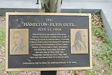 Not far from Deas' was a ledge 11 paces wide and 20 paces long, situated 20 feet (6.1 m) above the Hudson on the Palisades. This ledge, long gone, was the site of 18 documented duels and probably many unrecorded ones in the years 1798–1845. The most famous is the duel between Alexander Hamilton, first Secretary of the Treasury, and Aaron Burr, then Vice President of the United States, which took place on July 11, 1804;[35] this duel was re-enacted on its 200th anniversary (July 11, 2004) by descendants of Hamilton and Burr.[36] Three years earlier, a duel was held at this spot between Hamilton's son, Philip Hamilton, and George Eacker.[37] (Another source, however, puts the duel in Paulus Hook in Jersey City.[38]) Phillip, who had been defending his father's honor, suffered a fatal wound in his hip and his left arm and died two days later on November 24, 1801.[37]