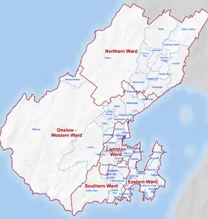 The council represents a population of 216,200 as of June 2023[3] and consists of a mayor and fifteen councillors elected from six wards (Northern, Onslow-Western, Lambton, Eastern, Southern general wards and Te Whanganui-a-Tara Māori ward).[n 1][4] It administers public works, sanitation, land use and building consents, among other local services. The council has used the marketing slogan "Absolutely Positively Wellington" in an official capacity since the early 1990s.[5]