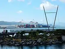 In 1969, the Government approved a recommendation from the New Zealand Ports Authority for the installation of a container crane at the ports of Auckland and Wellington.[59][60] Construction of the Wellington container handling terminal was underway by 1971, including a 49 ha (120 acres) reclamation at the end of Aotea and Fryatt Quays. Two new tugs, Kupe and Toia, were purchased to handle the larger ships expected, and a 40 tonne container crane was ordered.[61] Erection of the container crane began in early 1971.[62] The first container ship arrived in Wellington in June 1971, but was unloaded with conventional cranes, because an industrial agreement with unions had not yet been reached for the operation of the container crane.[63] A second container crane was ordered for the port and delivered in 1975,[64] but an industrial dispute with the boilermakers union caused delay to the construction.[65]