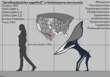 Wellnhopterus (lit. 'Wellnhofer's wing') is an azhdarchid pterosaur recovered from the Late Cretaceous Javelina Formation in Texas that was previously identified as a thalassodromine. It consists of a set of upper and lower jaws (TMM 42489-2), as well as some cervical vertebrae (TMM 42489-2.3 to 42489-2.8) and a fragmentary long bone (TMM 42489-2.9). In July 2021, the jaws were given the genus name "Javelinadactylus" (meaning "Javelina Finger"), with the type and only species as "J. sagebieli"; however, this article has now been retracted.[1] In a paper published in December 2021, the complete holotype was independently named Wellnhopterus, with the only species being W. brevirostris.[2] As of 2022, this is the formal name of this pterosaur.